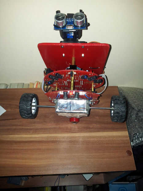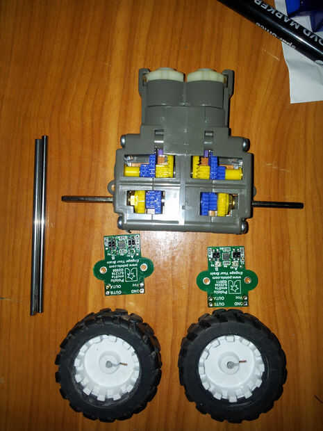 Las ruedas tienen crestas en el interior, para los codificadores rotatorios. Las ruedas y los codificadores rotatorios fueron diseñados para motores de caja de engranajes pequeña y tuve que modificar para trabajar con la caja de cambios que monta.