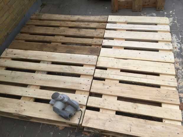 Las plataformas son un poco splintery. Dar la capa superior de las paletas de la cama rápidamente con la lijadora de banda. Funcionar la lijadora de banda en un ángulo de 45 grados a cada tablón en la parte superior de cada plataforma para acabar con los bordes un poco. Asegúrese de lijar bien los bordes exteriores, como estas son las partes puede aún entrar en contacto cuando estas paletas son la parte inferior de su cama.