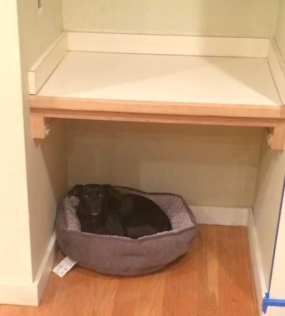 cuando compramos nuestra casa había un escritorio o abrir gabinete en un espacio del tamaño de una nevera. Decidimos reemplazar el escritorio (se muestra con un pequeño perro) con una barra, porque el consumo es el único negocio que hacer en la cocina.
