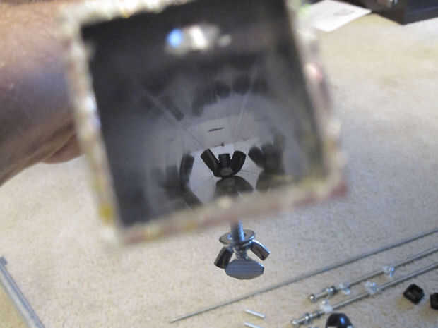 b. Coloque una tuerca de mariposa de segundo 1/4-20 en el canal de la caja que tiene el agujero de centro singular para el perno de cámara. Vibración excesiva que abajo hasta que está sentado sobre el agujero que ha perforado.