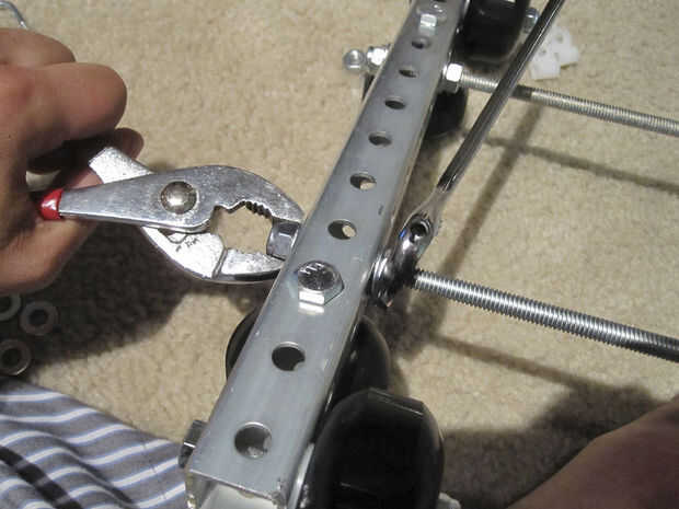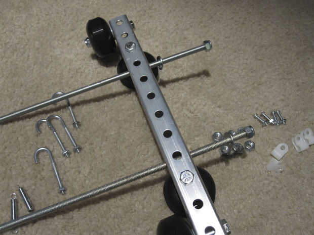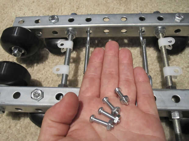 a. Enrosque otra tuerca en cada hilo de todos, un poco más de la mitad para arriba. Estas tuercas será un tope para el riel de atrás.