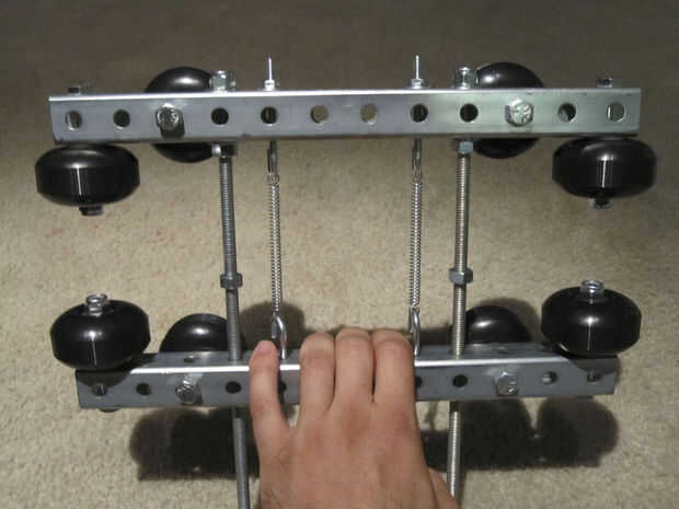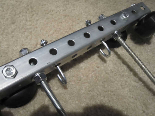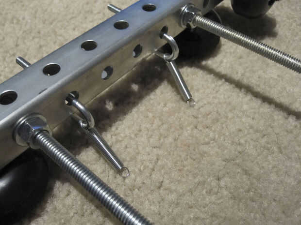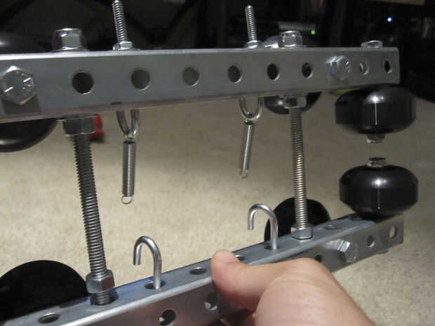 b. nuevo carril: Coloque los ganchos de J en una orientación similar, dejando un agujero en cada lado para el hilo de todos ir a través. La parte del gancho debe estar en el mismo lado que las ruedas principales.