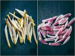 Quitar el estilo y la tapa blanca de la flor (se muestra en la foto de arriba). Cortar flor de plátano finamente. Mantenga en suero diluido para evitar que se decolore.