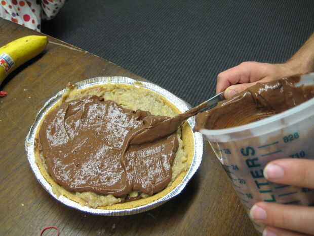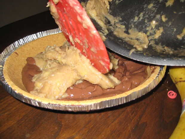 Sirva la mezcla de plátano en la tarta encima de la mezcla de pudín. Esparcir uniformemente.