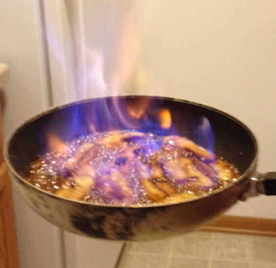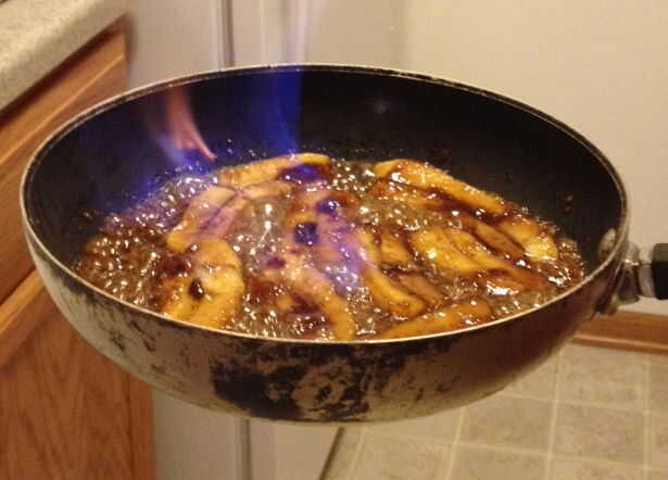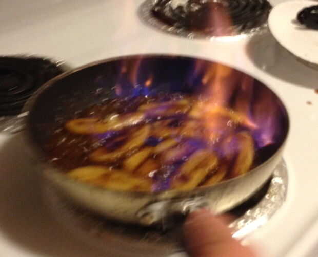Cuando agregar el ron a las bananas fomentar verter el ron directamente en la sartén con cuidado. El ron con una parrilla de luz o luz de la chimenea o partido, los que tienen un largo alcanzan en cuanto a no quemar la mano. No utilice un estándar del fósforo o un encendedor, se producirá lesión.
