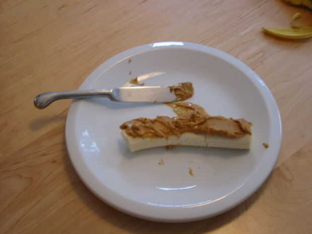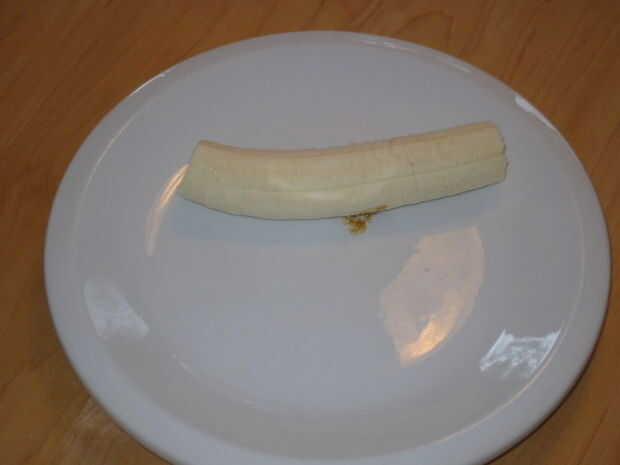 En primer lugar, pelar el plátano en cualquier manera usted sabe cómo. Luego se extendió una generosa cantidad de mantequilla de maní en el plátano pelado. ¡ Felicidades! Simplemente pela un plátano y poner mantequilla de maní en él!