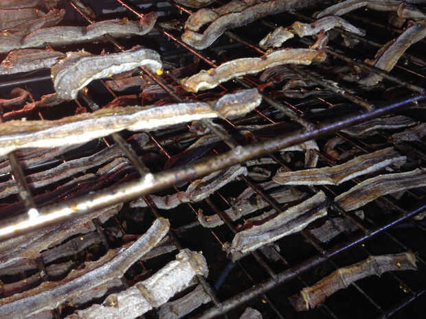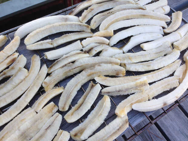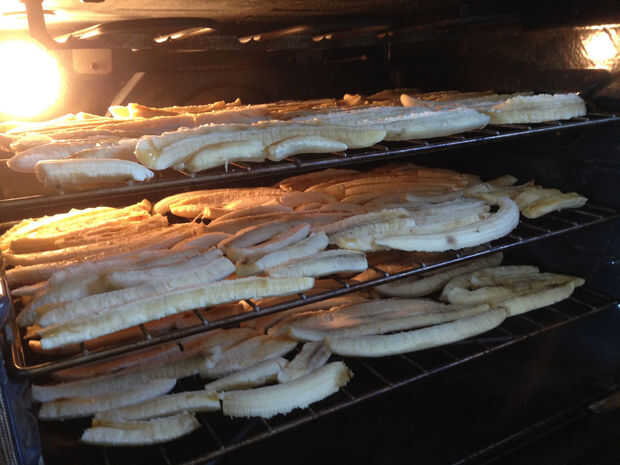 Precalentar el horno a 150 grados Fahrenheit y coloque los estantes de las secciones de banana o 'divide' en el horno, espaciando los estantes aparte.