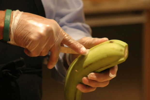 c) tomar el dedo pulgar y correr de arriba a abajo, debajo de la piel, elevación de la piel de plátano. Esta es una técnica que hará más fácil cuando se pela el plátano verde entero.