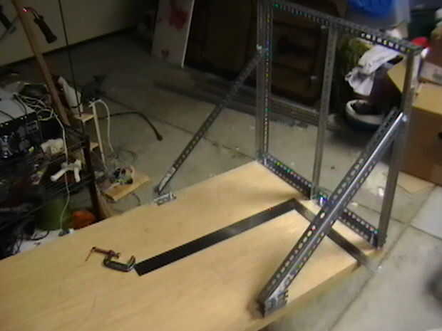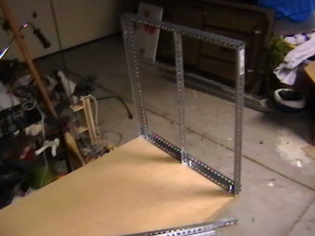 Afortunadamente estaba disponible en 2 pies pre cortar tiras del hierro de ángulo, pero corta fácilmente con una sierra para metales. Una plaza de este ángulo de hierro fue empernada junto con 5/16 en los pernos que conectan en las esquinas y a la pieza base de madera. Una tercera pieza vertical fue conectada para que funcione como una barra de lo que será un 4 barra acoplamiento mecánico.