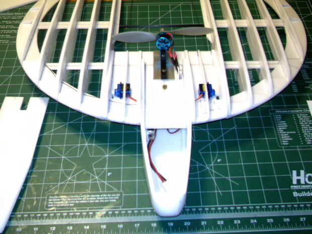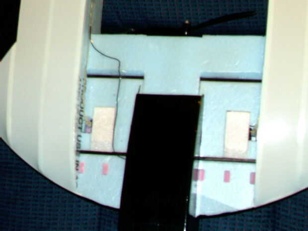 12. es el momento de instalar los servos.  Utilice costilla R1a para ayudar a localizar el punto de instalación.  Yo prefiero cortar un agujero para el servo sistema en y al ras con la parte inferior del disco.  Esto es una buena idea también porque los brazos de control son apenas tiempo suficiente para extender a través de la espuma.  Tenga en cuenta la antena del receptor va a través de las costillas del lado derecho.