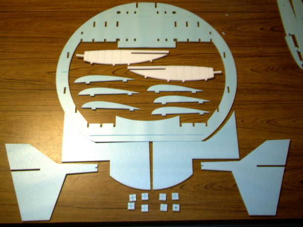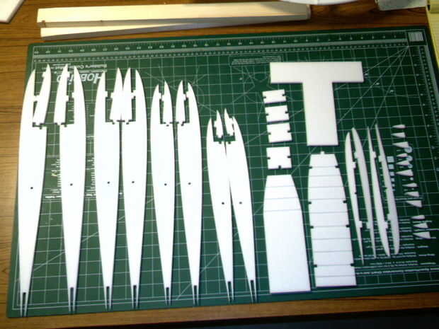 Aquí son las partes que fueron cortadas por el PhlatPrinter.  El tipo preferido de la espuma es blanca 6mm espesor depron.  Algunas fotos muestran partes de una espuma de prototipo azul barato que usar llaman doble ventilador.  Es el material a utilizar durante el ejercicio cómo encajan las piezas.
