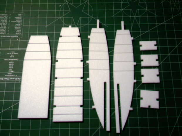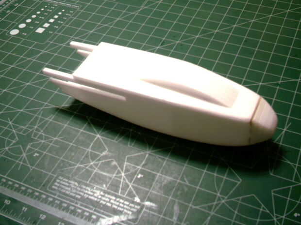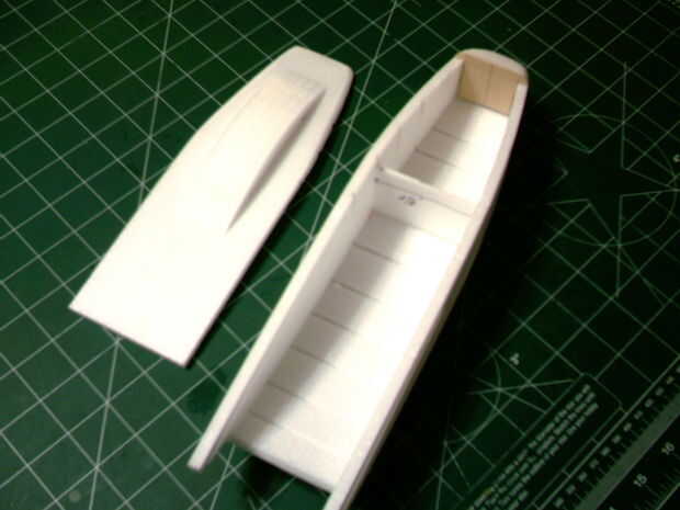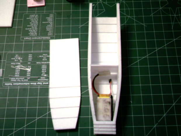 Montar el fuselaje a continuación.  Doblar la parte inferior y los lados en las líneas de doblez para hacer forma curva.  Estas piezas de la muesca juntos.  Mantener cuadrado pegado.  Antes de pegar las piezas de la 4 nariz en, ayuda a cuadrado a los lados y la parte inferior de la parte delantera del fusible.  Después de que el pegamento se haya secado muy bien, el fuselaje en forma de arena.  La parte superior del fusible utiliza 5 piezas curvas para formar el pabellón.  También ayudan a la escotilla para el fusible de la forma.  Coloque estos por lo que es la poción más alta de la cubierta hacia la parte posterior.  Tenga en cuenta el pedazo de madera bajo o capas en la parte delantera del compartimento de pilas.  Una clavija de 1/8" se pega a la escotilla que se inserta en un agujero hecho en esta pieza.  La escotilla también utiliza un imán para sostener el extremo de popa.  Cuando la parte superior tiene un lugar para un imán para pegar.  Además, hay un ¾ "x 2" ½ pieza que tiene un hueco cortado en lo que se instala en el disco justo debajo de la ubicación del imán de la portilla.  Me gusta utilizar un panel de 3mm para separar la batería del resto de los equipos.  Se puede ver un ejemplo en la imagen siguiente.