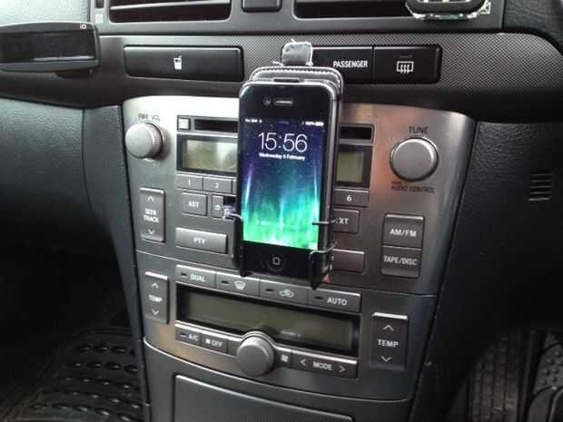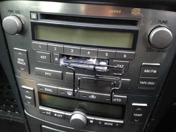 mi Avensis 04 todavía tiene una cubierta de cinta, que nunca se utiliza. Y necesitaba un lugar para montar mi teléfono sin hacer muchas alteraciones o fastidiando con el guión. Esta solución trabaja un convite. Todo lo que necesitas es un colgador de ropa, pinzas, un casete de cinta, algunas cintas y unos 10 minutos.