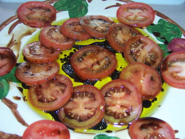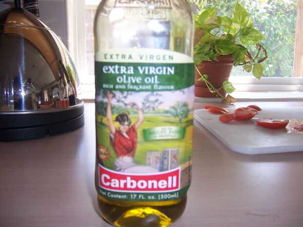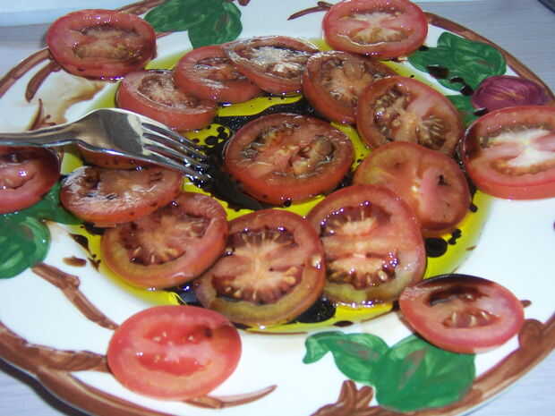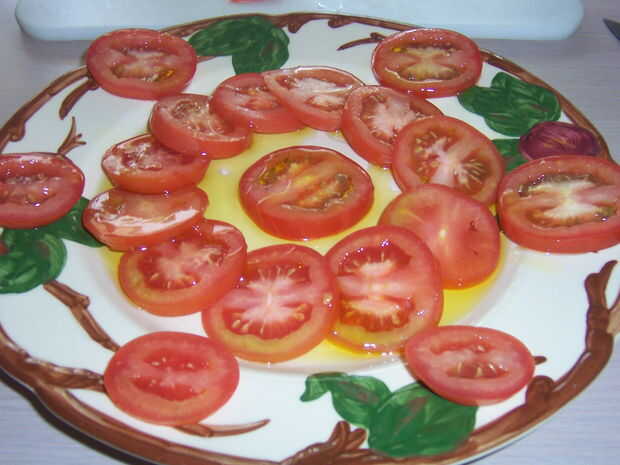 Ya que tendrás una diferente cantidad de tomates y rodajas cada vez que haga el plato, allí realmente no cualquier medida de ajuste a la hora de añadir el aceite. Sólo viértalo de la botella lentamente hasta que cada sector tiene un poco de aceite en ella. Si el aceite parece falto, añadir un poco más.