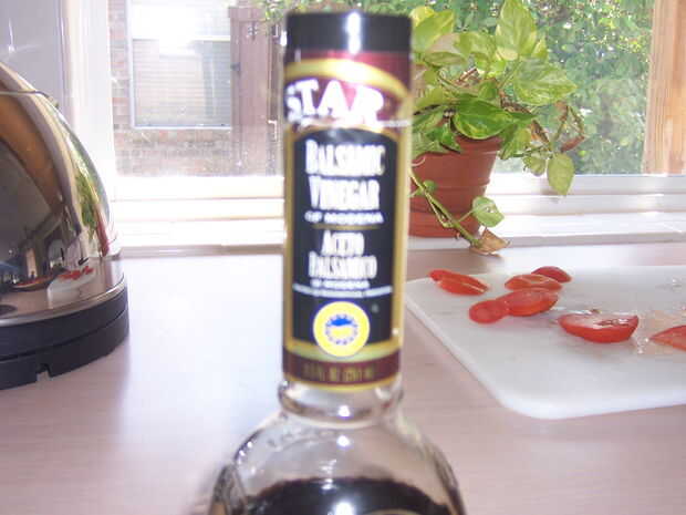 A continuación, pasar a la del vinagre. Una vez más, este es un vinagre, vinagreta de no. Ya que este es un vinagre, que no queremos añadir demasiado, o bien el plato será muy amargo. Hacer lo mismo que hiciste con el aceite de oliva, pero con un poco más de precaución. puesto que los líquidos son de dos viscosidades y densidades, lo tienden a pegarse. Si usted siente que ha separado demasiado, agitar el líquido con un tenedor