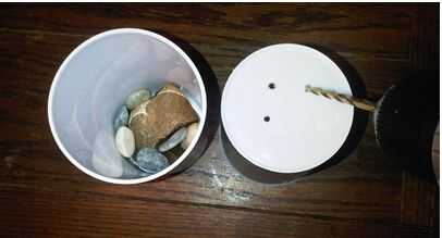 Llenar una taza con acerca de una pulgada y media de rocas limpias (hervirlas primero si se encontraron afuera). Haga dos agujeros más espaciados 2 pulgadas aparte una pulgada por debajo del borde de la Copa
