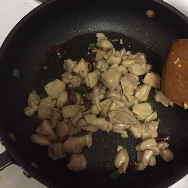 Mezcla el jengibre cortado, cebolla verde y el cubo de pollo frito en sartén, se fríen durante 30 segundos.