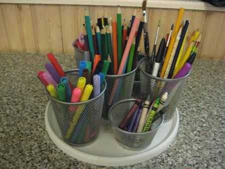 Pegamento caliente las tazas en un arreglo agradable del plato y llenarlo con bolígrafos, lápices, pinceles, crayones, tijeras, gomas de borrar, etc..