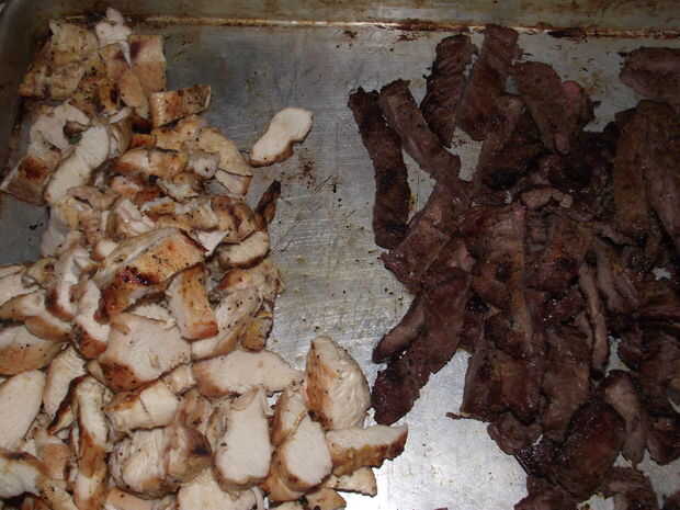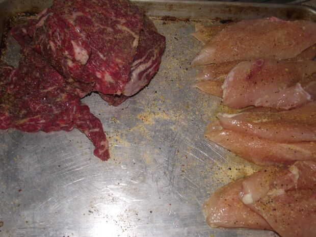 Ahora quieres sazonar generosamente el pollo y Fajitas. También como nota real Fajitas no sólo filete corte pero hay una carne real para esto. A veces se llama falda de res o churrasco. Si usted no ha tenido que desea cazar algunos gustos increíble. Es un poco más caro porque proviene de la debajo de las costillas por lo que hay sólo dos cortes en una vaca entera. Ahora para condimentar las carnes. Yo les cubra con sal de temporada de johnny, el ajo en polvo y pimienta de limón. Recuerde a ambos lados de la temporada. Ahora parrilla, cuando todo es bonito todo y a la plancha lo es ahora tiempo para cortar las carnes y prepárate empezar a acodar!