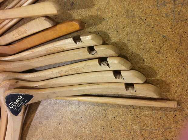 El siguiente paso puede ser complicado sin las herramientas adecuadas pero con una sierra de vaivén o de tabla puede hacerse con facilidad. Una herramienta de corte pequeña en una dremel de mano funciona tan bien. Tomar cada percha y luego para arriba con los centros alineada todos la misma dirección. Hacer marcas en cada gancho en un punto aproximadamente 1 pulgada arriba de la punta de cada brazo de la suspensión. Sus marcas deberían ser ligeramente más anchos que el ancho del diámetro de sus varillas. Para ello en ambos brazos de suspensión en 5 de las 9 perchas. Una vez que está marcada cada suspensión puede cortar una muesca sobre el grueso de su espiga asegurándose de no cortar completamente el brazo de suspensión dejando mantener suficiente material para un tornillo tomar. Asegúrese de que sus muescas se cortan en un ángulo de 90 grados cuando la suspensión está sentado recto hacia arriba y hacia abajo sobre la mesa. Una vez que todas las muescas se hacen estás listo para comenzar la Asamblea.