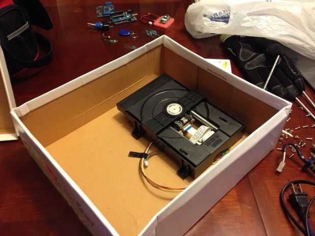 Básicamente, sólo desmontar todos los componentes internos del reproductor de DVD. Había trabajado con uno bastante grande, por lo que recomiendo trabajar con uno que es más pequeña. Averiguar que trabajo de botones de la bandeja del CD y reutilizarlos como los botones que te empuje para abrir y cerrar la bandeja cuando necesite.