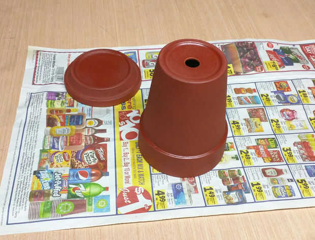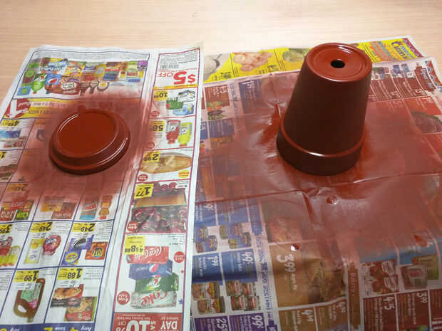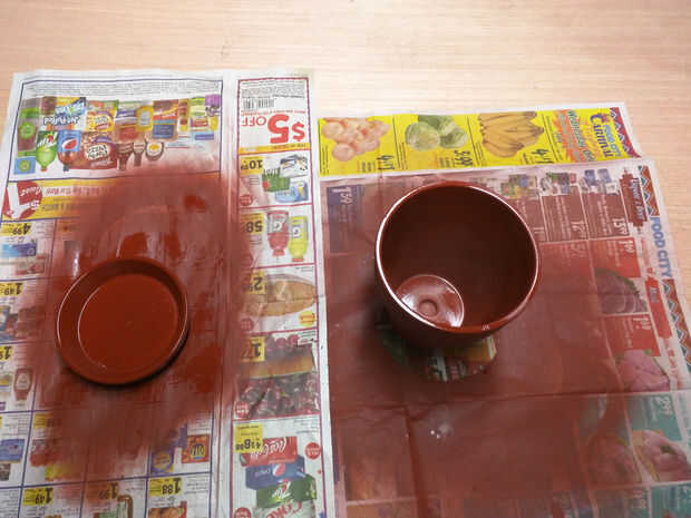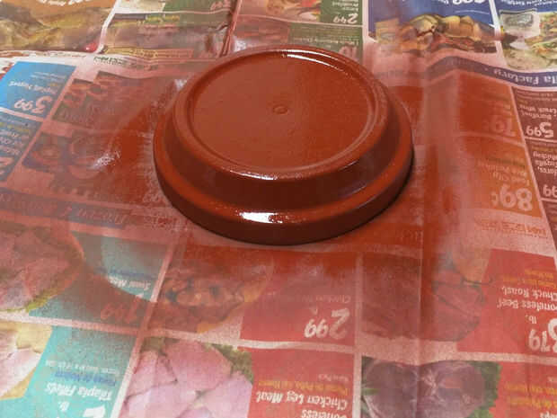 Di la cazuela de barro y plato de 2 capas de imprimación marrón rojiza dentro y por fuera, en un área bien ventilada. (establecer el periódico si no quieres hacer un lío)