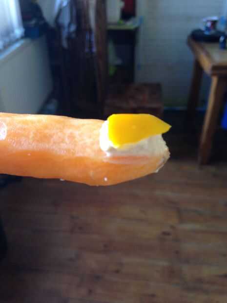 • Primera al, pela la zanahoria. • Luego cortar el extremo más grande a un tamaño que más le convenga. • Cortar un pequeño triángulo de pimienta y palillo en con algunos humus.