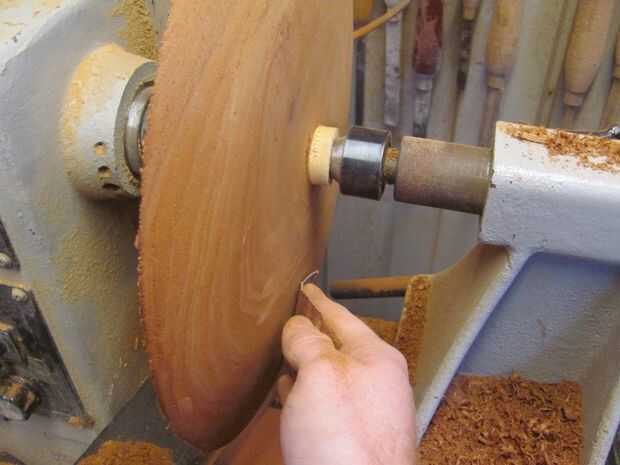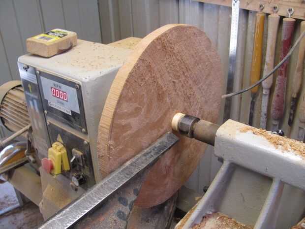 Después de más o menos cortar un círculo en la Sierra de cinta, perforé un agujero poco profundo con una broca forstner de 50mm. Con el mandril había unido el espacio en blanco para el torno. Con platos me gusta usar el contrapunto para aplicar presión. Utilizar un pequeño disco de pino para evitar que el centro en el plato de la marca.