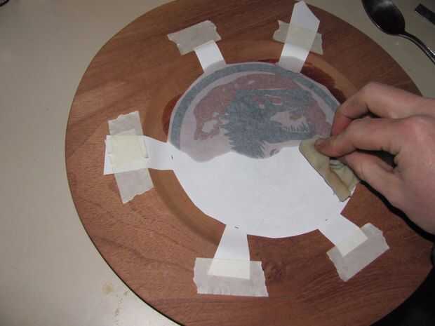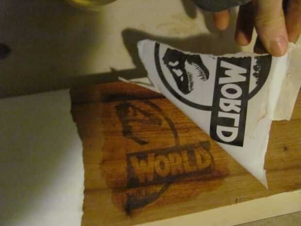 Este es un truco que aprendí hace unos años. Funciona utilizando terps para reactivar la tinta de la impresión hacia fuera y empuje sobre la madera.