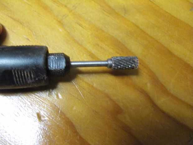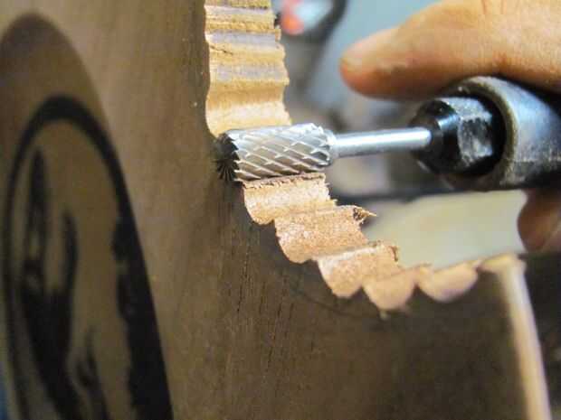 Para ello corté aproximadamente la forma de utilizar la sierra. Utilizando la dremel y la fresa cilíndrica trabajé la forma en el corte. Mecía hacia adelante y hacia atrás para aliviar la presión sobre la herramienta de corte.