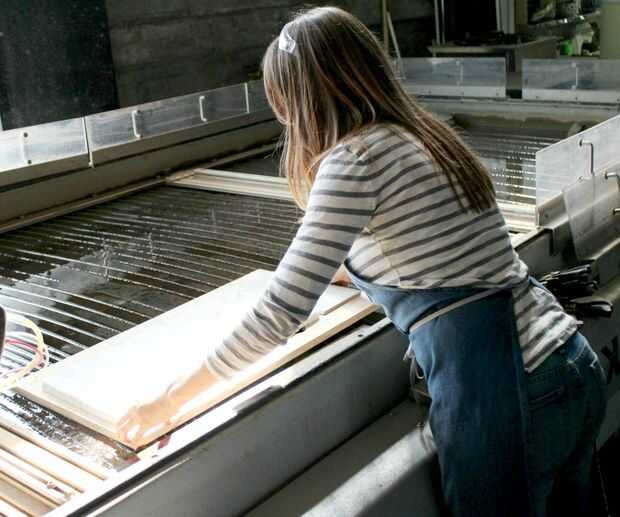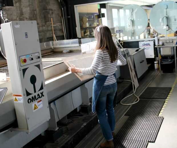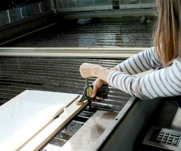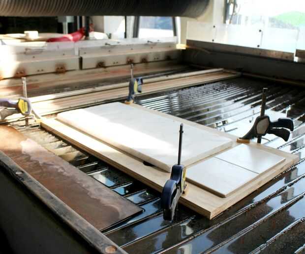 Coloque su material montado en la cama de corte de chorro de agua. Asegúrese de que el borde de la madera contrachapada es paralelo al borde de la cama. (como en la foto) Coloque 4 abrazaderas alrededor del borde de la madera contrachapada asegurando el material en su lugar. Asegúrese de que las abrazaderas sean fuera la forma de la cabeza de corte para ese primer corte de la nube.
