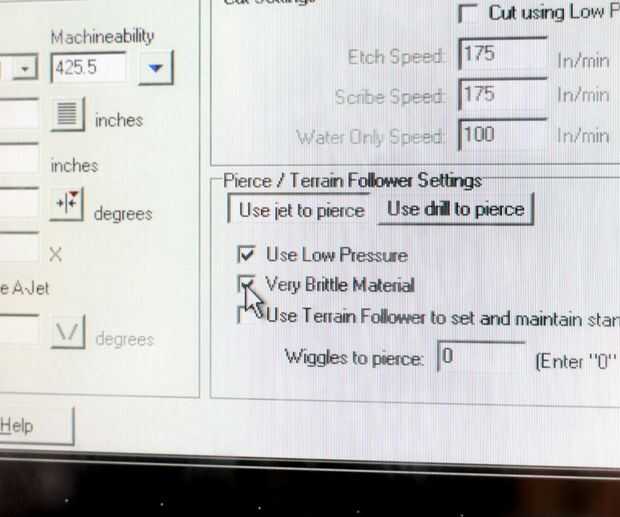 También asegúrese de ajustar el grosor un poco grande mayor que el espesor real de sus materiales combinados (madera y mármol en el caso de este primer corte). Desea que el chorro de agua pase a través de ambos materiales y crear un montón de burbujas en el agua. Las burbujas será el indicador que se establece el espesor correctamente.