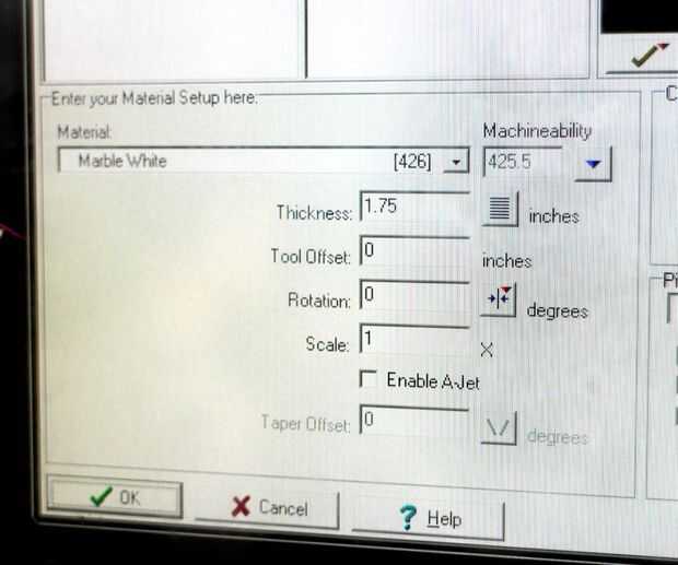 Al abrir el archivo ORD de plato de nube en el hacer, asegúrese de seleccionar el tipo correcto de material (mármol blanco) y haga clic en 'material muy frágil'. Uso de baja presión auto llenado cuando haces eso.