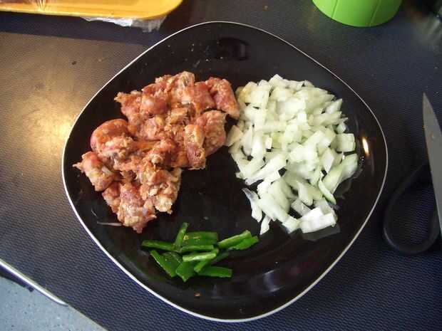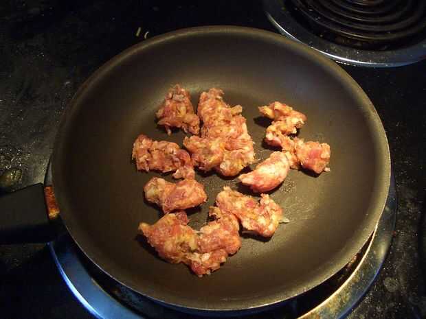 3. Tome la salchicha de su carcasa y dividirla en pequeñas piezas (es más fácil cuando se cocina)