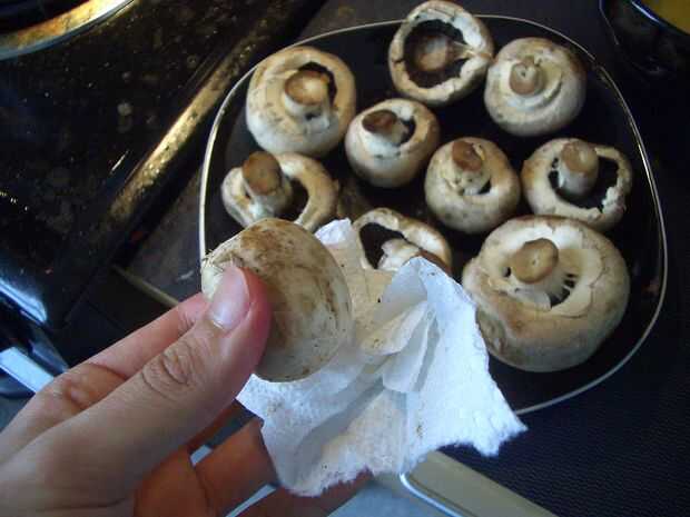 5. una vez que el aceite se calienta a fuego medio bajo, gota en la parte superior de setas primero para que el tallo se está pegando para arriba