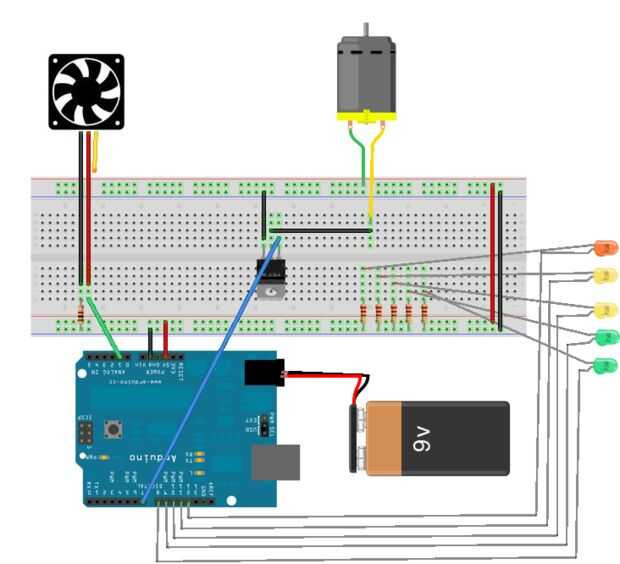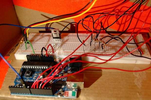 Fije la batería, protoboard y Arduino dentro de la caja y conectar todo otra vez. Conecte la pila, elija una cinta y... hacerlos bailar!