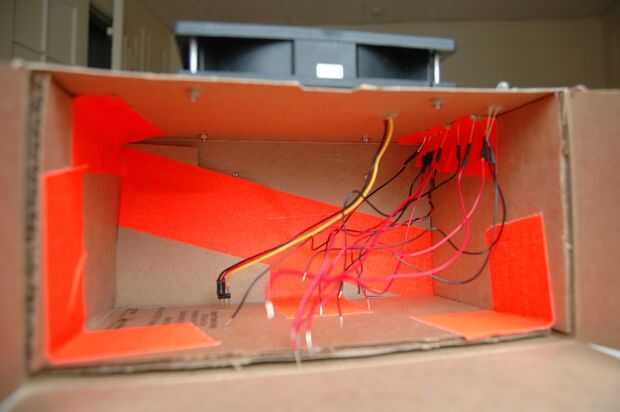Construir un recinto agradable de cualquier material tiene disponible y conecte los dispositivos a ella. Puesto que mío era cartón, me fijo el reproductor de cassette y el ventilador con sus tornillos, y era fácil perforar agujeros para los cables. Tendrás más trabajo con materiales más resistentes, pero se verá mejor.