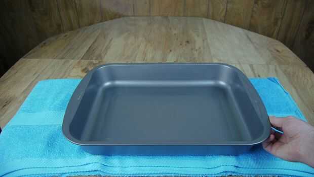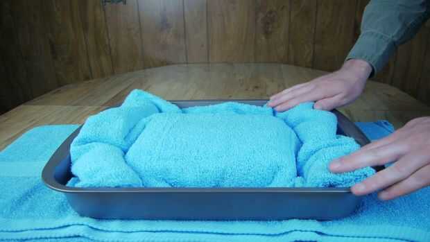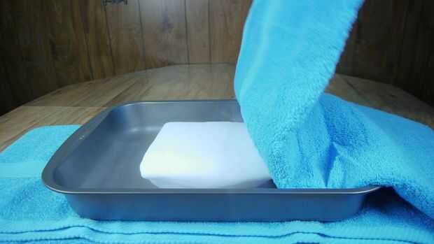 El primer paso en el montaje de la placa fría es colocar una toalla debajo una bandeja para hornear grande para aislar de la tabla. Esto servirá para proteger la tabla del extremo frío tanto también aumentará la eficiencia de la placa fría.