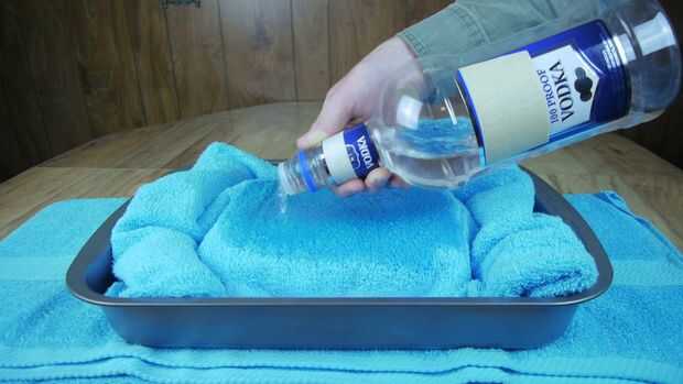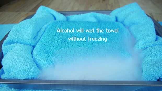 Para aumentar la tasa en que el hielo seco es capaz de enfriar la superficie de la placa del frío de la sección de la toalla directamente sobre el hielo seco es mojada con algún vodka prueba alta (100 prueba o mejor) o alcohol para fricciones. Alcohol de uno u otro tipo debe utilizarse para este paso, como congelar agua y reducir la efectividad. Si se usa alcohol isopropílico debe tenerse cuidado para evitar que en el helado como no comestibles.