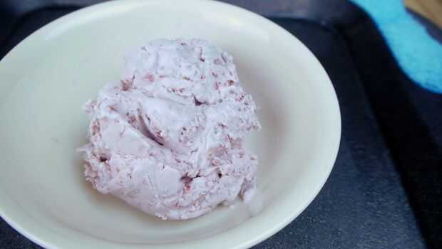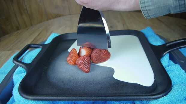 Con el helado hizo una pequeña porción de la mezcla se vierte sobre la placa de frío ahora escarchada y pueden agregarse saborizantes. Aquí estoy usando unas fresas que pueden ser picados con un par de espátulas como el enfriado del helado. Puede tomar algunos minutos para que el helado alcanzar la consistencia deseada si los ingredientes no eran refrigerados antes de su uso. Es una batalla entre la placa tratando de enfriar el helado y el aire de calentamiento, así que si usted está tratando en la luz directa del sol en un día de 120 grados podría funcionar más rápido si usted puede encontrar algo de sombra. El hielo seco no debe tener ningún problema en ganar en el final.