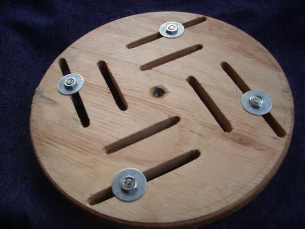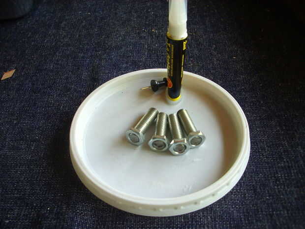 Como se mencionó anteriormente, el peso del conjunto debe mantenerse tan bajo como sea posible. En consecuencia, en lugar de usar regulares tuercas para sujetar los tornillos en su lugar, decidí usar tuercas media, que se corta en dos trozos iguales. Una vez cortado con sierra y agradeble con piedra, tornillo para arriba en cuatro piezas de varilla roscada de 5 / 16 y pegadas en su lugar con pegamento, por lo que son como las cabezas de tornillos.