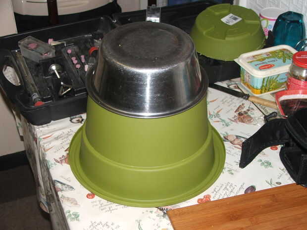Ponga la maceta boca abajo e invierta el plato del perro sobre ella.