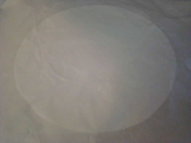 a continuación, ponga una pieza de tela de algodón 100% en la parte superior el encaje lateral del plato, con el papel de pergamino, voltee el plato a la tela.  Retire con cuidado el papel para hornear.