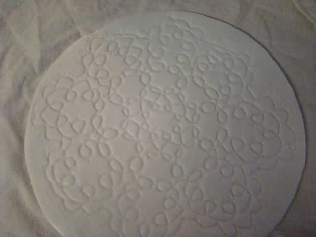 Cubrir el fondo del plato con la otra pieza de tela.  Otra vez dan la vuelta a la tela.