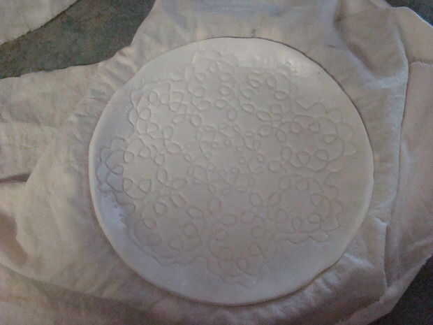 Lugar la arcilla, todavía en el paño, en el vaso (o cerámica) plato de su elección y hacer como liso y centrado posible. Coloque la arcilla (plato y todo) en el horno y hornear durante 15 minutos. Cuando desaparecen los 15 minutos, apague el horno y deje enfriar el plato dentro del horno. Una vez que esté frío, quitar el plato nuevo usando a la tela y luego quitar a la tela de la parte inferior del plato