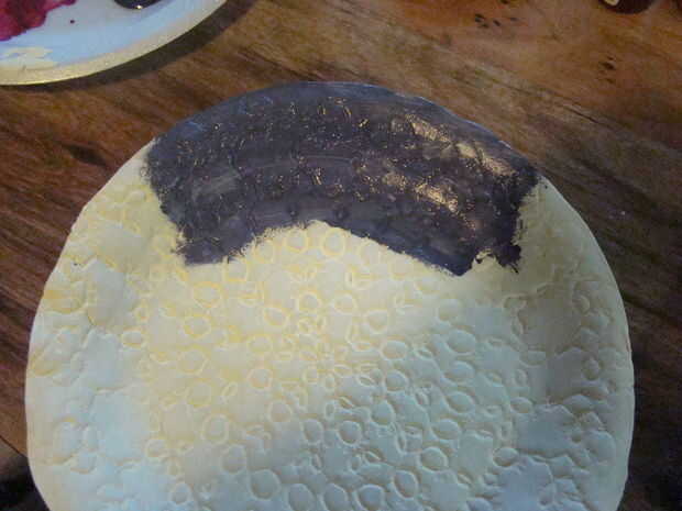Luego escojo un color más oscuro de la pintura acrílica y adelgazado con agua.  Entonces cepillado de la pintura más fina sobre una pequeña área del plato,