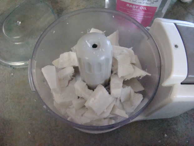 Picado encima de la arcilla en pedazos pequeños y lo colocó en el recipiente picador.