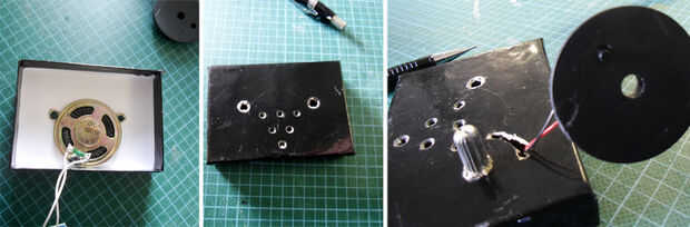 Crear aberturas en la tapa cerca de cada perilla del potenciómetro para pasar los cables desde la parte inferior de la cubierta a través de a la placa de circuito.