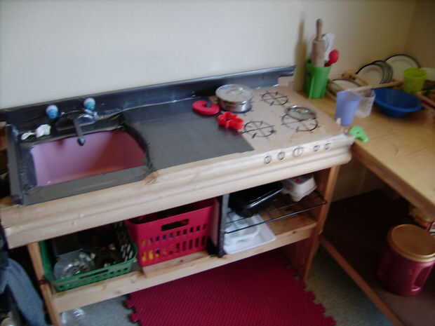 La imagen principal es una selección de tarjetas de juego comida en cocina de juguete de mis hijos. La segunda es una vista de la cocina, que es sí mismo hackeado de un modular estantería sistema (similar a las estanterías IVAR Ikea, si desea iniciar desde el mismo lugar que lo hice), con una selección de los materiales encontrados/reciclado. La tabla que forma la "L" se lanzaron por una guardería local y he rescatado con permiso.