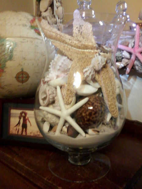 hay muchos estilos diferentes que usted puede elegir para hacer su "playa en un tazón de fuente". He utilizado arena y conchas y un tazón de vidrio o copa. Pero si quieres una estilo/apariencia diferente entonces puede utilizar diferentes materi